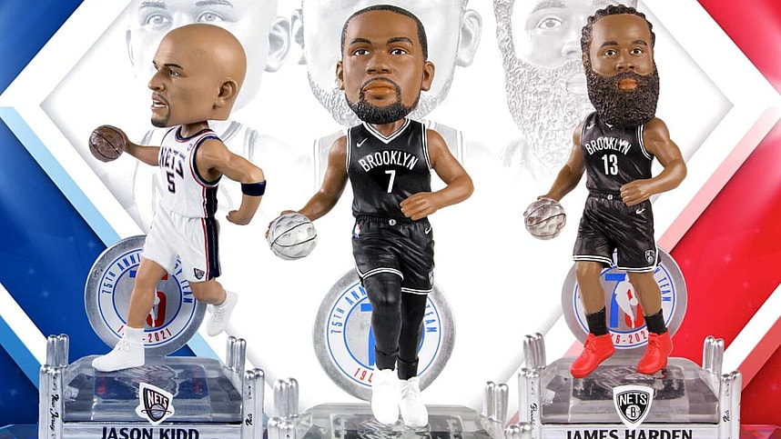 Kidd’s bobblehead sport the throwback Nets home jersey of the 2000s. Durant and Harden are clad with the classic black and white Brooklyn jersey.