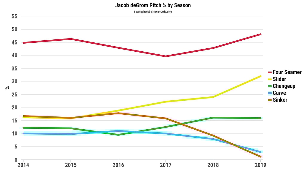During the 2019 season, batters hit .348 and slugged .435 on deGrom’s curveballs. They had a .364 wOBA. However, the expected numbers say he got a little bit unlucky and was victimized by small sample size (just 19 batted ball events involving the hook.)