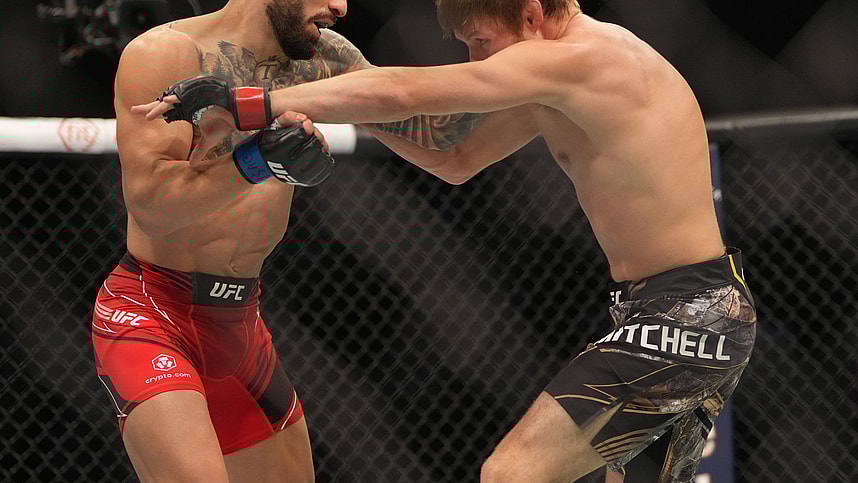 He was swinging a little wild at times, but overall, he was extremely effective. Late in the round, Mitchell was able to get a takedown and had control to end the round. In the second round, it was all Ilia Topuria. He ended up dropping Mitchell and then he actually dominated the grappling exchanges.