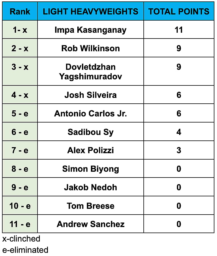 That said, Silveira ended up making the playoffs himself. Silveira was ahead of Antonio Carlos Junior (16-6) entering Friday night due to his quicker finish in the first round. All Carlos Junior needed to do was secure a win in anyway to make the playoffs. However, he lost a decision to Alex Polizzi (11-4) which secured Silveira’s spot.