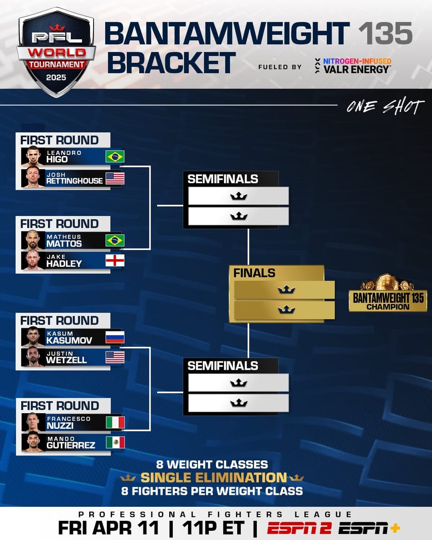 Higo enters the tournament having won two fights in a row including a win over James Gallagher last March. The former LFA bantamweight champion is 5-1 in his last six fights and he is looking to make a statement in his tournament debut tomorrow. The full PFL Bantamweight World Tournament bracket can be viewed below.