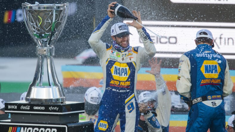 But Elliott did say a special boost was waiting for him before lowered his window net before the green flag: a message from Johnson, whose seventh and final title came in 2016, when he likewise had to go the length of the field to earn a championship. Shortly after Elliott ran and led the 312th and final lap of the race, he and Johnson met on track for a high-five from their cars, unable to remember what they were saying due to the noise generated by the pure ecstasy of victory and revving of their respective Hendrick engines. It wasn’t the first time Elliott and Johnson celebrated a debut victory together. After Elliott’s first Cup win at the 2018 Watkins Glen even came through careful fuel management, Johnson’s No. 48 pushed the bone-dry No. 9 back to the front of the grandstands at the start/finish, where the celebration could officially begin.
