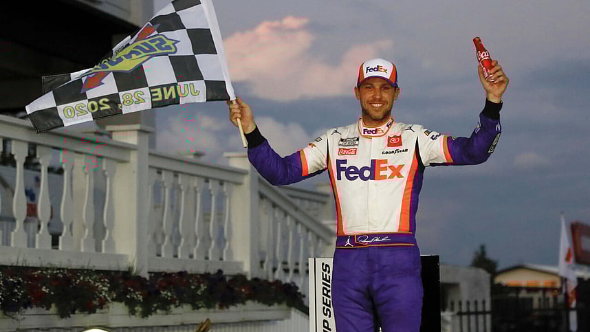 Denny Hamlin passed Kevin Harvick with 13 laps to go in the Super Start Batteries 400 at Kansas Speedway, earning his series-best fifth win of the NASCAR Cup Series season. It also marks Hamlin’s second straight win at Kansas, having won the playoff race there last fall.