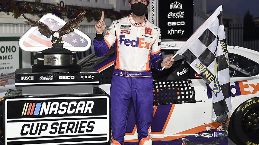 It was auto racing deja vu all over again at Sunday’s Pocono 350. The second half of a NASCAR Cup Series weekend doubleheader, the first of its kind, featured the same top pair of finishers. Denny Hamlin, however, was glad to see the order reversed this time around.