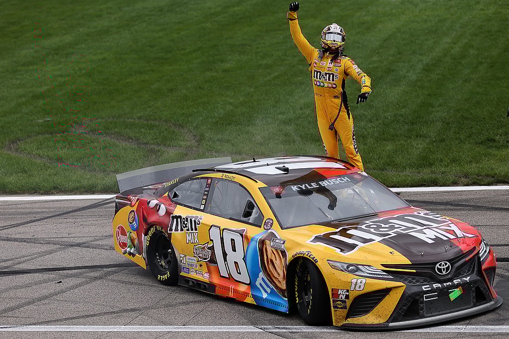 KANSAS CITY, KANSAS – MAY 02: Kyle Busch, driver of the #18 M&M’s Mix Toyota, celebrates after winning the NASCAR Cup Series Buschy McBusch Race 400 at Kansas Speedway on May 02, 2021 in Kansas City, Kansas. (Photo by James Gilbert/Getty Images)