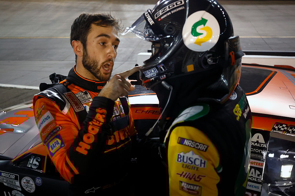 As the race dipped under 50 laps to go, Elliot, Harvick, and Larson broke away from the rest of the field. Elliott and Harvick ran into lapped traffic and made contact as they got around Josh Bilicki. The friction cut down Elliott’s left front tire, forcing him to pit road with 33 laps to go. Relegated to lapped traffic, Elliott bumped Harvick after the forced service. Their confrontation continued on pit road after the race and later moved to Elliott’s hauler.