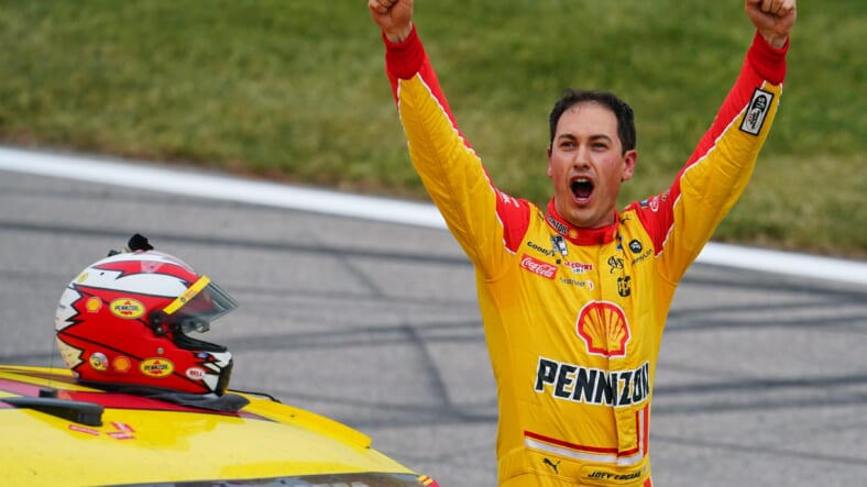 Joey Logano’s well-timed pit stop allowed him to beat out Kevin Harvick at Kansas, making him eligible for the NASCAR Cup Series title.