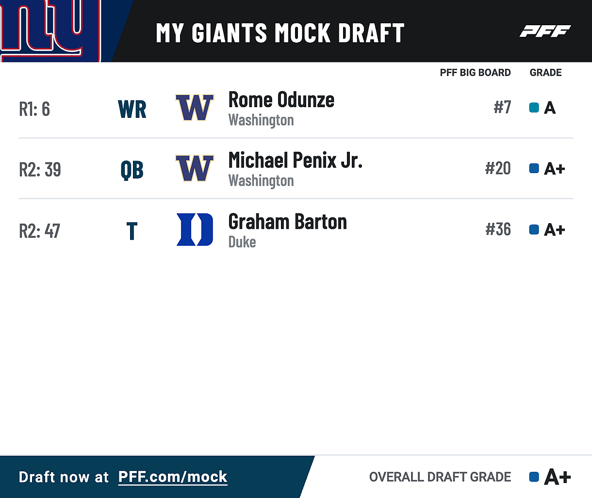 In this mock draft, the Giants reunite this elite duo in the Big Apple, drafting Odunze in the first round and giving him continuity at quarterback with Penix in the second round.