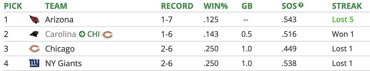 According to Tankathon, the Giants currently hold the fourth overall pick in the 2024 NFL Draft. The Arizona Cardinals hold the first overall pick, followed by the Chicago Bears (from the Carolina Panthers), the Bears once again (their own pick), then Big Blue.