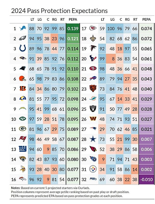 With Runyan Jr. and Eluemunor in the starting lineup, the Giants’ offensive line is expected to be significantly improved in pass protection. In a chart posted by Open Source Football’s Ben Baldwin, the Giants ranked 13th in the NFL in 2024 Pass Protection Expectations. The chart aims to guess offensive line strength given the five starters listed on Ourlads and their past performance in pass protection (as measured by grade):