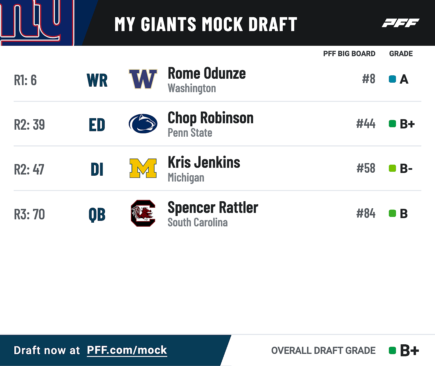 In this mock draft, there was a run on quarterbacks early, then a run on playmakers. With all three of the top quarterback prospects and the top two wide receivers off the board, the Giants take Washington wideout Rome Odunze.