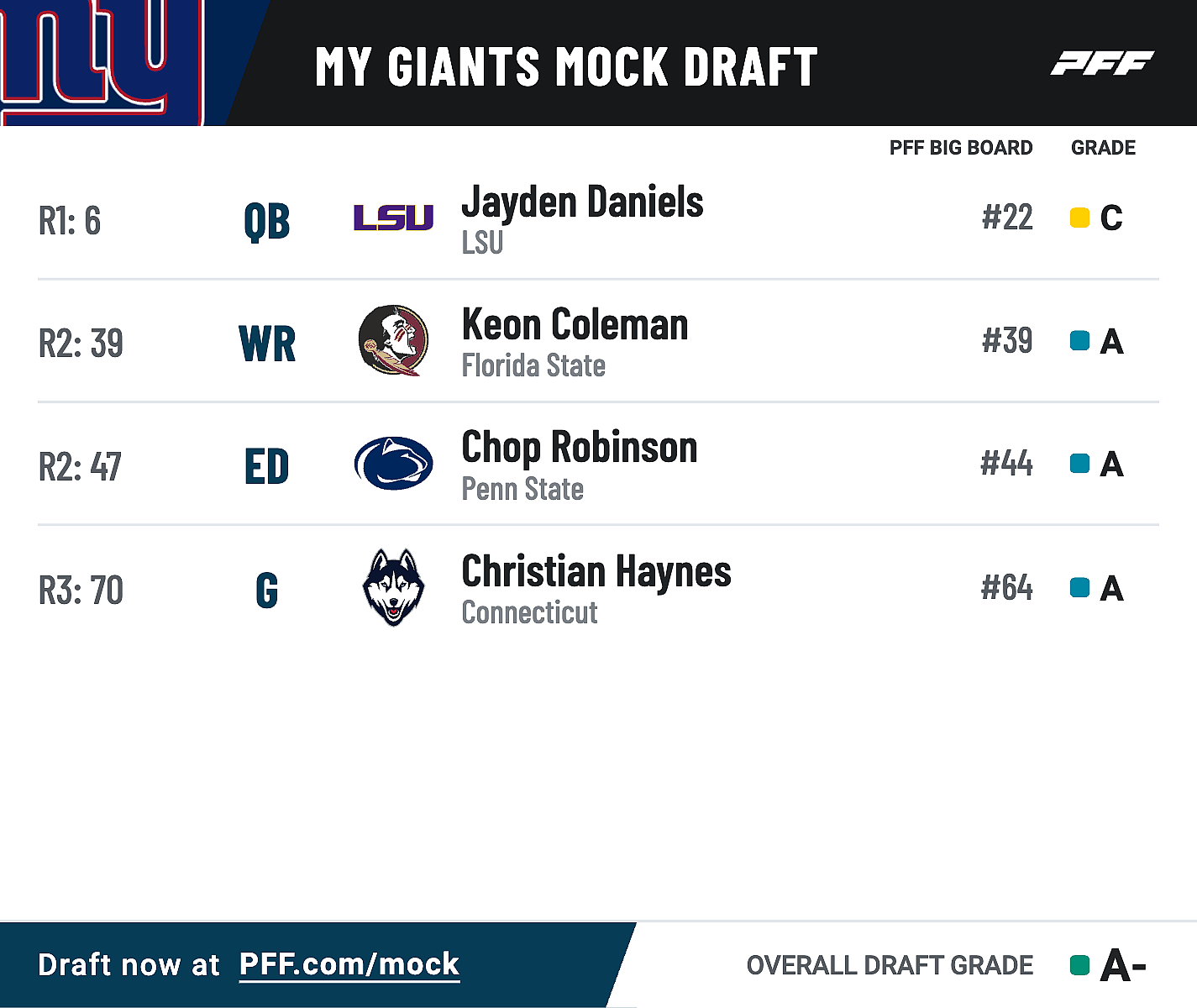 This mock draft almost looks too good to be true — and it likely is. With no trades, it’s difficult to accurately project what a mock draft will look like. The Giants would be lucky if Daniels was still on the board with the No. 6 pick and it is still possible that Coleman will be drafted in the first round. But if the board were to fall this way, as it did in the PFF Mock Draft Simulator, this would be a home-run draft class for Big Blue.