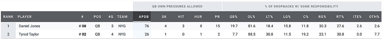 Even with superstar running back Saquon Barkley in the lineup, Jones is still allowing a higher rate of pressure than Taylor.