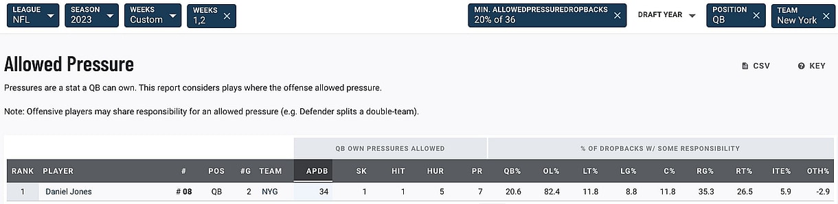 According to PFF, Daniel Jones is responsible for 20% of his pressure this season.