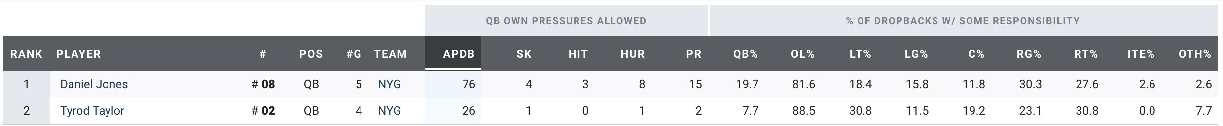 According to PFF, Daniel Jones is responsible for 20% of his pressure this season.