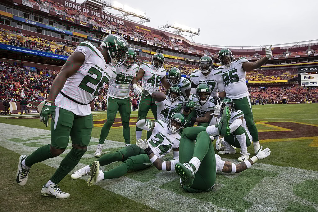 LANDOVER, MD – NOVEMBER 17: Neville Hewitt #46 of the New York Jets celebrates with teammates after intercepting a pass against the Washington Redskins during the second half at FedExField on November 17, 2019 in Landover, Maryland. (Photo by Scott Taetsch/Getty Images)