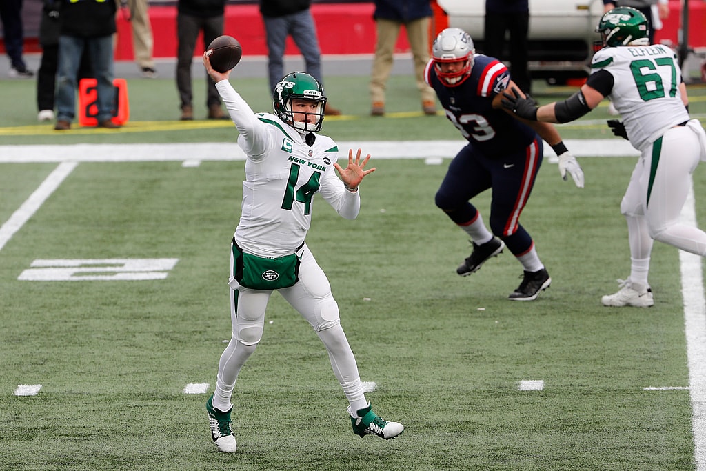 Jan 3, 2021; Foxborough, Massachusetts, USA; New York Jets quarterback Sam Darnold (14) throws on the run against the New England Patriots during the first half at Gillette Stadium. Mandatory Credit: Winslow Townson-USA TODAY Sports