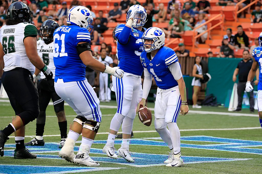 Dec 24, 2019; Honolulu, Hawaii, USA; Brigham Young Cougars quarterback Zach Wilson (1) celebrates with teammates after running in a touchdown against the Hawaii Warriors in the second half of the Hawaii Bowl at Aloha Stadium. Mandatory Credit: Marco Garcia-USA TODAY Sports