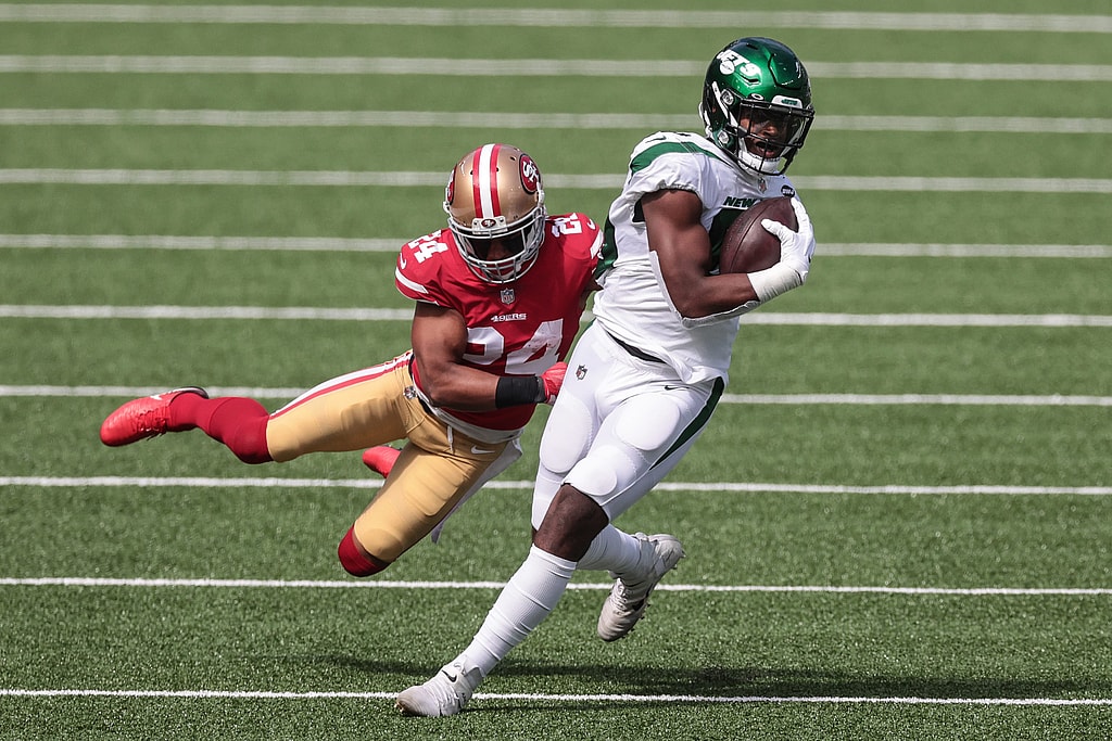 Sep 20, 2020; East Rutherford, New Jersey, USA;New York Jets tight end Chris Herndon (89) is tackled by San Francisco 49ers cornerback K’Waun Williams (24) during the first half at MetLife Stadium. Mandatory Credit: Vincent Carchietta-USA TODAY Sports