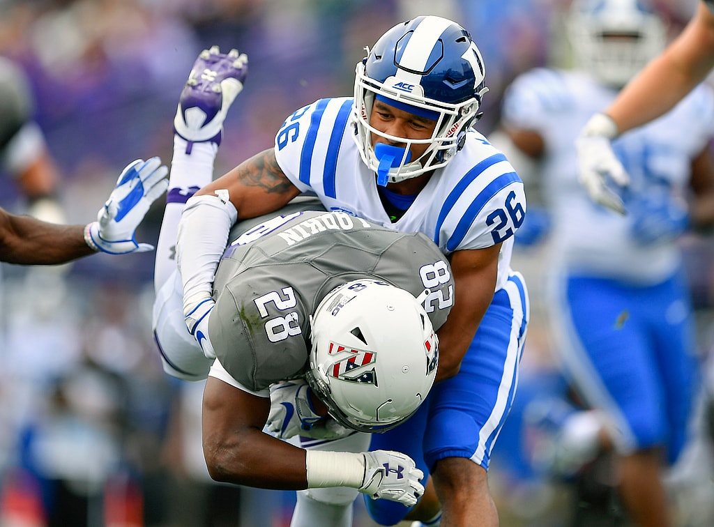 Sep 8, 2018; Evanston, IL, USA; Duke Blue Devils safety Michael Carter II (26) tackles Northwestern Wildcats running back Jeremy Larkin (28) in the first half at Ryan Field. Mandatory Credit: Quinn Harris-USA TODAY Sports