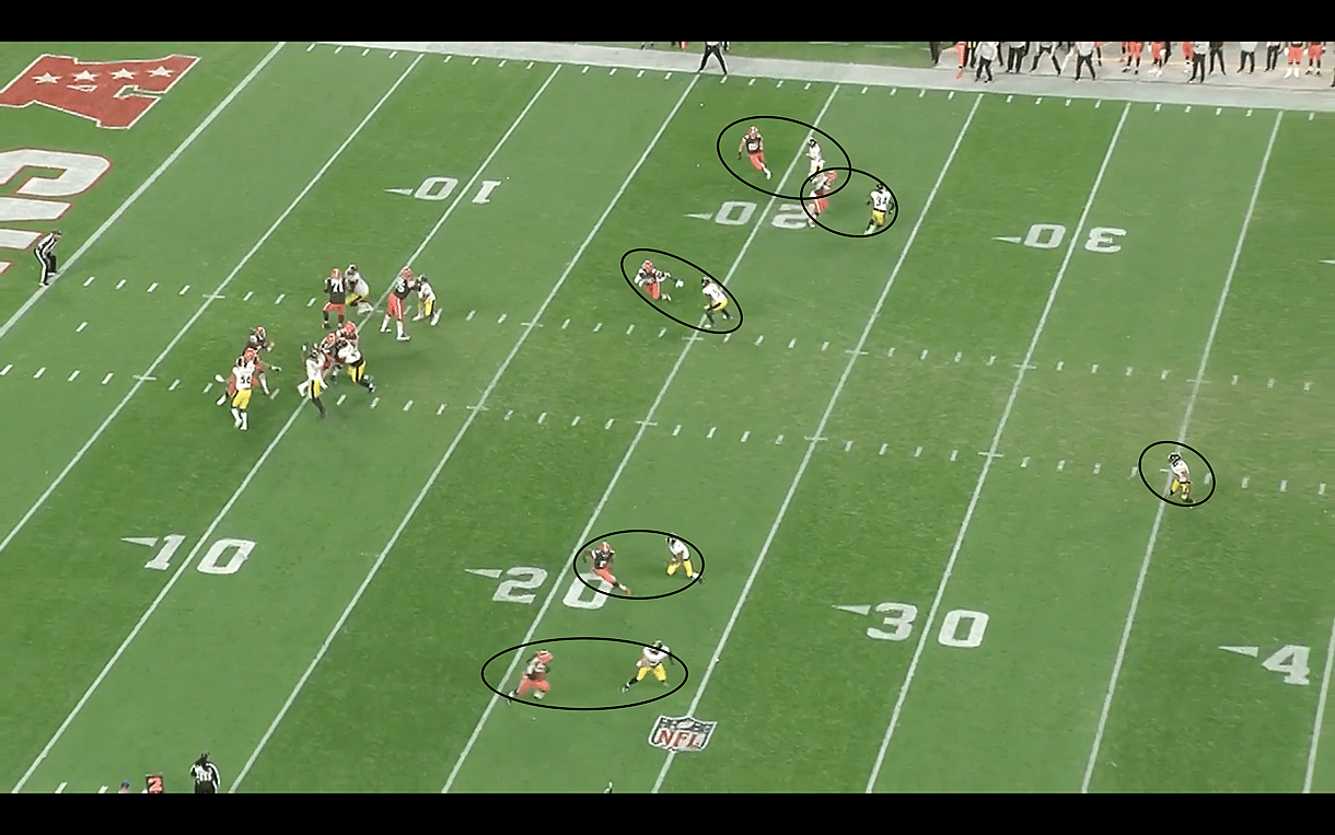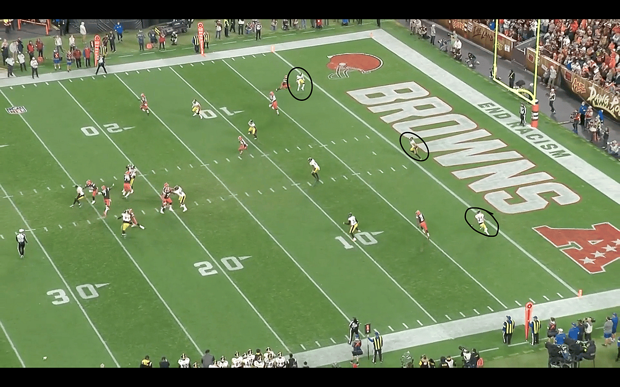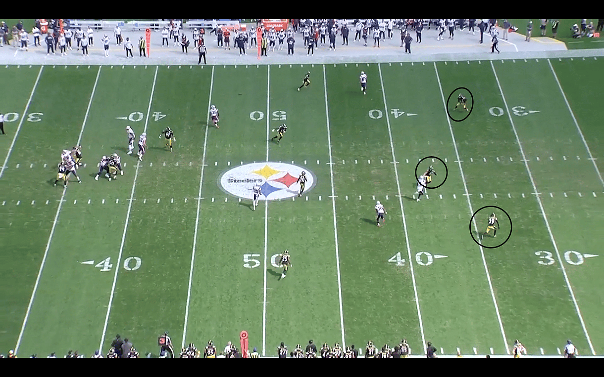 The Steelers have shown a tendency to keep things off-balanced from a coverage perspective. For starters, they can rotate their safeties late pre-snap or right after the ball is snapped, with one rep shown below as Minkah Fitzpatrick drops back late.