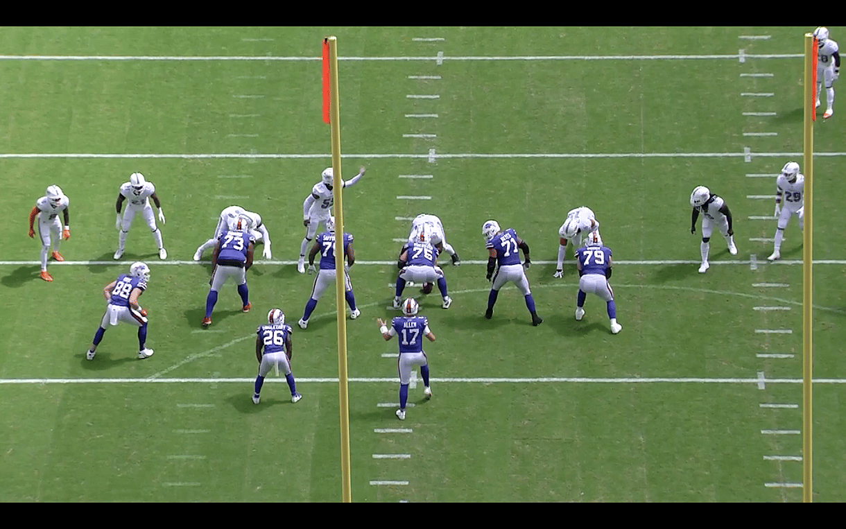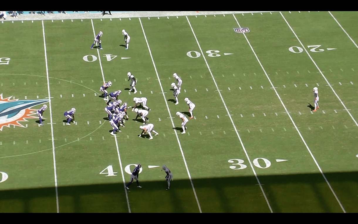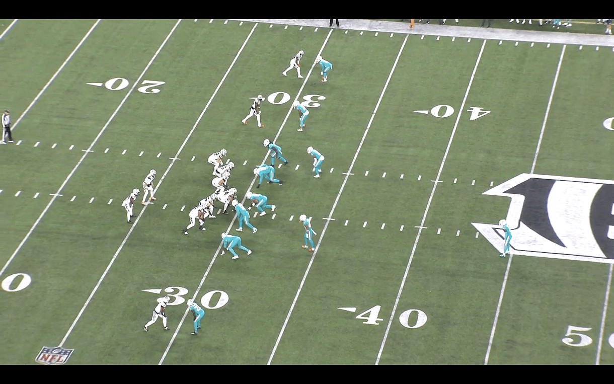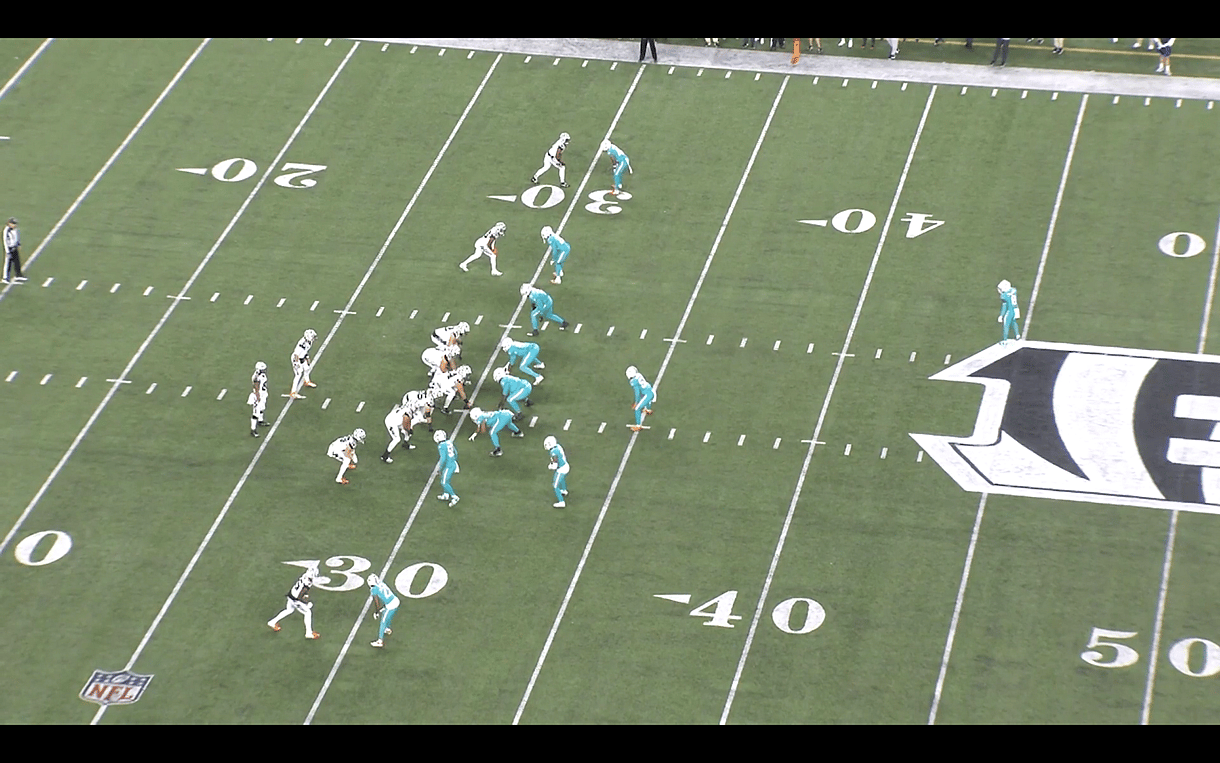 Two takeaways from the Bills game in terms of the Dolphins’ defensive front were their NASCAR packages (first picture) and their eight-man boxes. The versatile Emmanuel Ogbah and long-time, accomplished veteran Melvin Ingram were the two most active players up front for them in these two games.