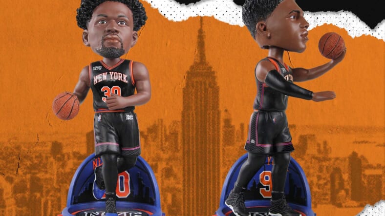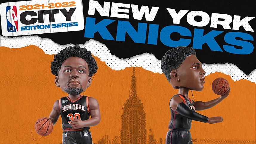 Barrett and Randle’s bobbleheads are portrayed in an action pose wearing their alternate city jersey with the cityscape in a thematic, team-colored as backdrop. Both bobbleheads stand atop a Madison Square Garden-themed base with the Knicks logo (circa 1995-96, 2010-11) displayed in front.