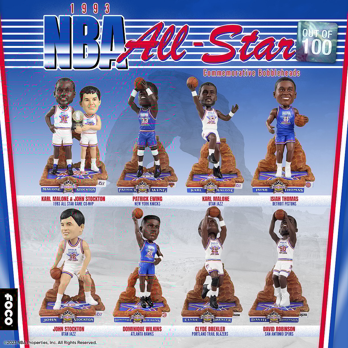 The seven-inch bobblehead also features a star-shaped accent on top of the base with a jersey number display, while the 1993 NBA All-Star Weekend and team logos are emblazoned on the front.