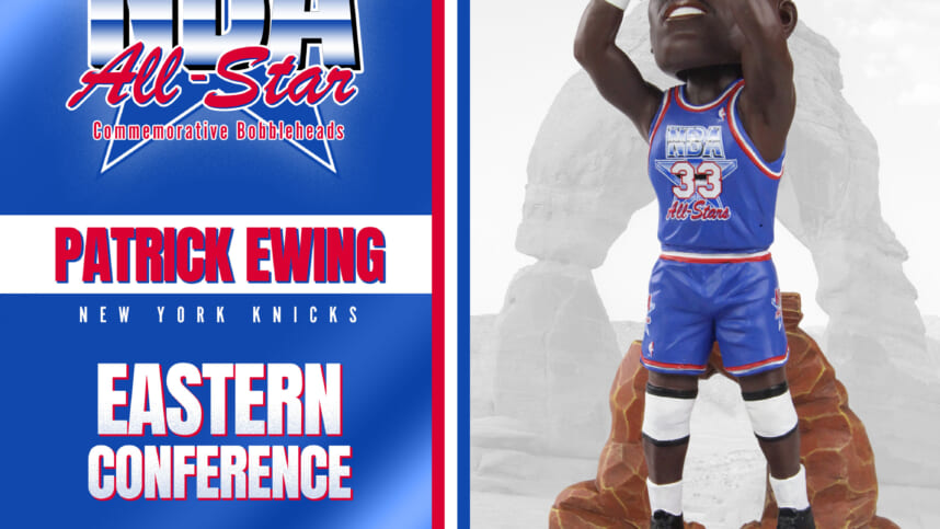 Ewing’s bobblehead portrays him in an action pose while wearing his All-Star game jersey with a thematic mountain backdrop and base, a nod to Salt Lake City.