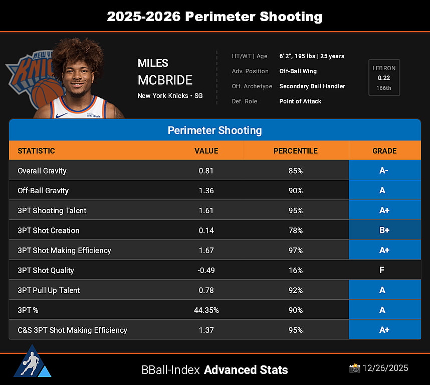 According to Basketball Index, McBride ranks among the best outside shooters in the league, a statement that would seem unimaginable a few seasons ago.