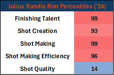 That’s not the only side of the ball where Mikal Bridges’ impact will be felt, as while Donte DiVincenzo is the better shooter, Bridges has strong shooting abilities of his own and is a strong shot-creator. His ability to draw attention from defenders because of his strong perimeter offense and ability to facilitate for himself and others makes him a perfect pairing not just with Jalen Brunson, but with Julius Randle as well. We all know the physical threat Randle can be for a defense, but the numbers back up just how deadly he can be at the rim: