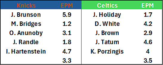 You’d think Mikal Bridges would improve upon his 2023-2024 EPM numbers (which is the data we’re using for this graphic), but even if everyone remains the same on both sides, the Knicks would have a lineup that stacks up with the very best in the NBA. This is a huge trade for the Knicks with the potential to result in a championship, but now they’ll have to prove that they can stay healthy and get the job done when it matters most.