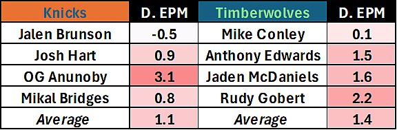 A +1.1 Defensive EPM would rank in between the 84th and 85th Percentile whereas a +1.4 would rank between the 87th and 88th Percentile, hardly enough of a difference to freak out over. Furthermore, Mikal Bridges’ +0.8 Defensive EPM could improve as he moves to a secondary role defensively instead of being the definite primary defensive wing. The Knicks are extremely well-constructed to mask the problems that Karl-Anthony Towns has defensively, and we could be looking at an offense that finishes near the top of the league in efficiency and volume metrics.