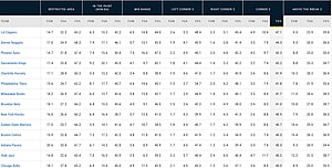 Their opponents are attempting half of their shot attempts from 15 feet away (50.2 percent frequency) and holding them down to just 37.3 percent in that zone, which ranks no.2 behind four teams — the Bucks, Utah Jazz, Charlotte Hornets, and the Los Angeles Clippers — tied on top with 37.2-percent clip.