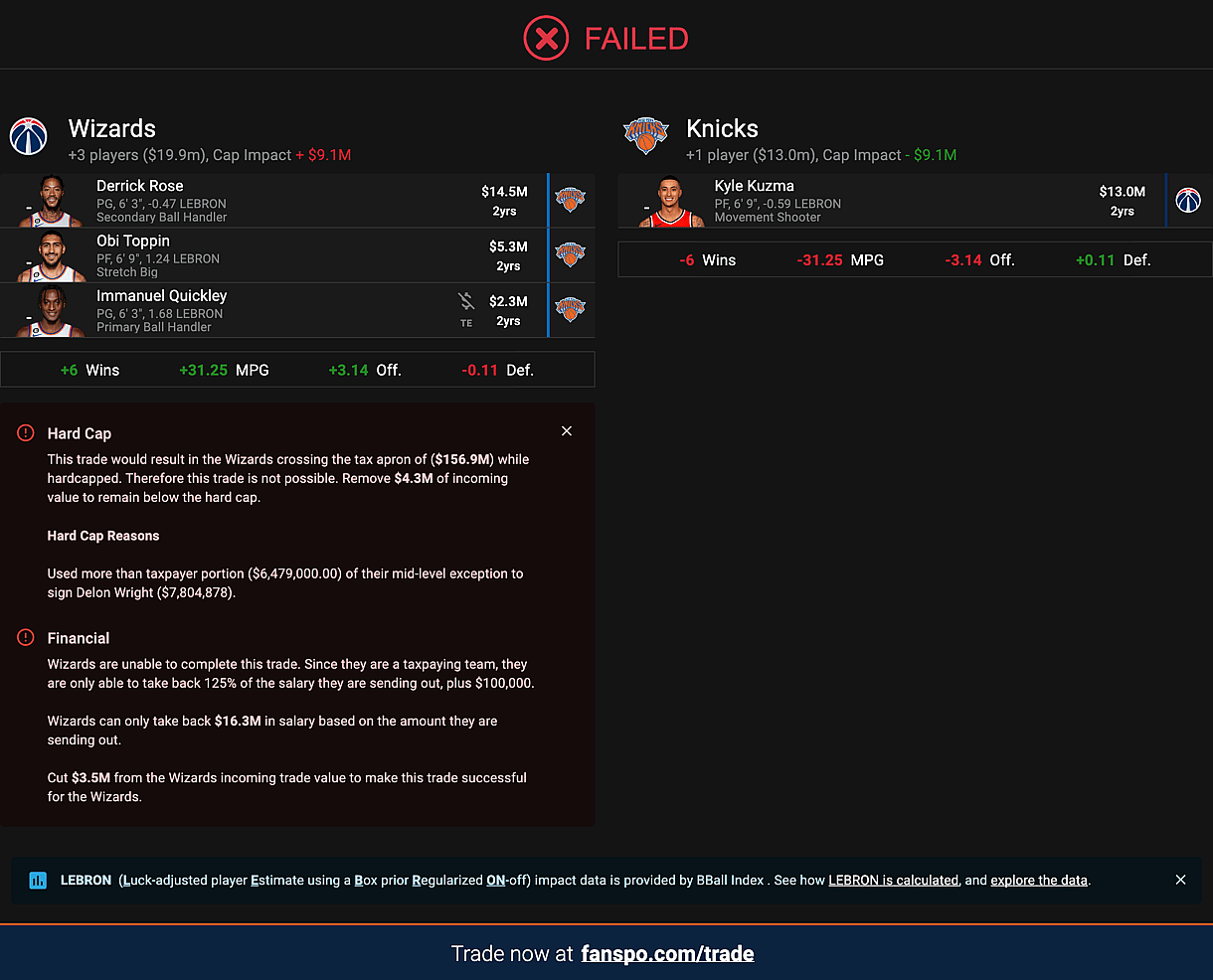 But a direct swap of Kuzma for a Knicks package consisting of Rose, Quickley, and Toppin won’t make the math work. Only Rose and one of Quickley or Toppin could satisfy a trade. Perhaps the Wizards and Knicks could expand it to include more players from Washington.