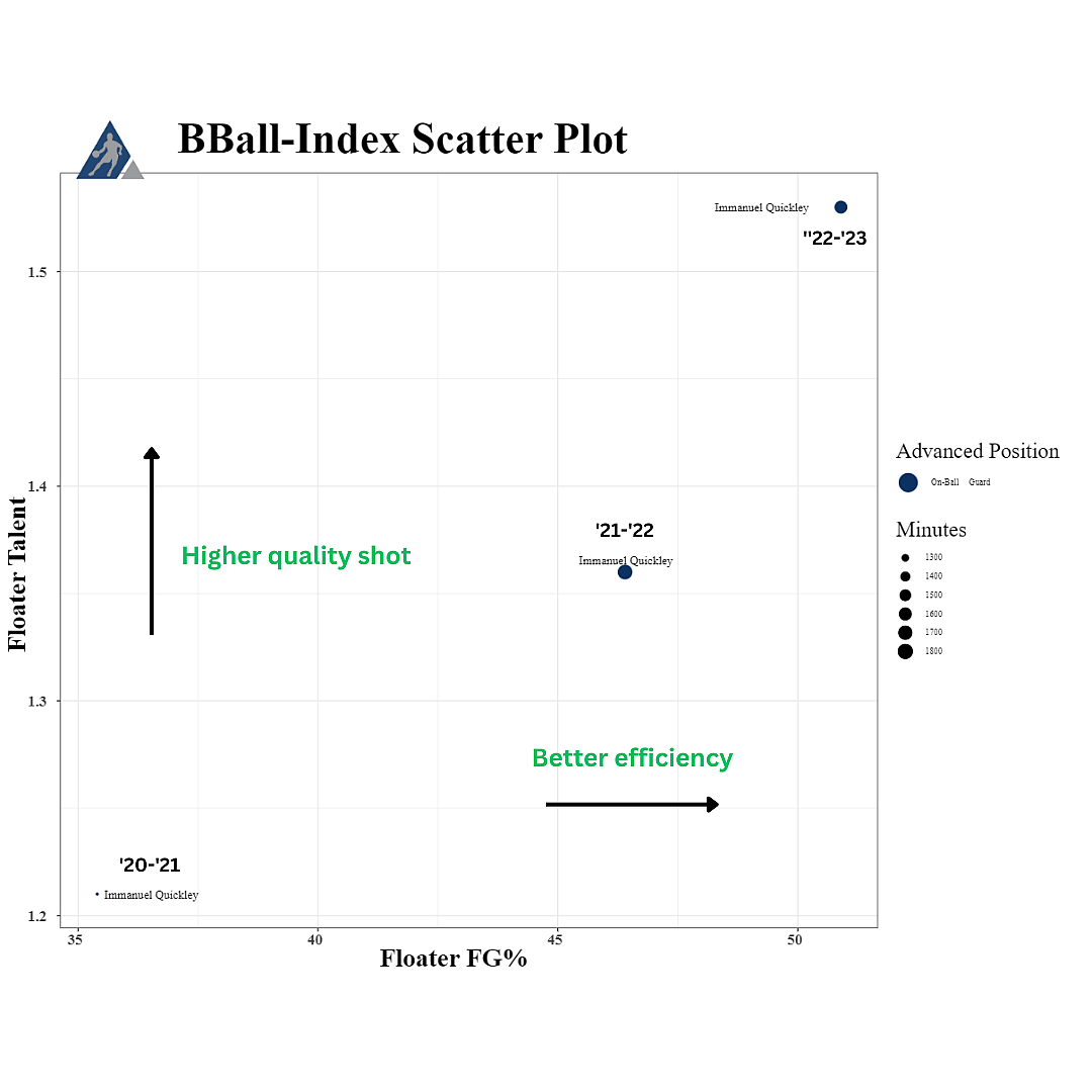 Quickley’s yet to return to the heights he did in 2020 in terms of three-point shooting, but a 35.7% clip on 4.9 attempts a game is still a strong number. On top of that, Quickley’s improved his floater and interior scoring tremendously, which has led to the best True Shooting rate of his career (56.2%). Quickley has always had a strong floater, but this is easily the best version of that shot that we’ve seen at the NBA level, and the numbers back this up, with each year his numbers on that shot improving.
