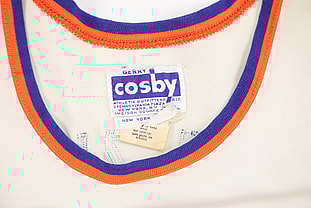 The jersey’s tags are still intact, with Cosby size 46 and wash tag in the neck, partially stitched into the name’s lettering on the back. New York is stitched across the chest in individual lettering, number 10 on front and back, all in orange-on-blue tackle twill, while the name on the back is all blue. There is a minor stain on the left shoulder and a light pencil-written number 46 near the left armpit, possibly because the size was partially obstructed in the collar tag.
