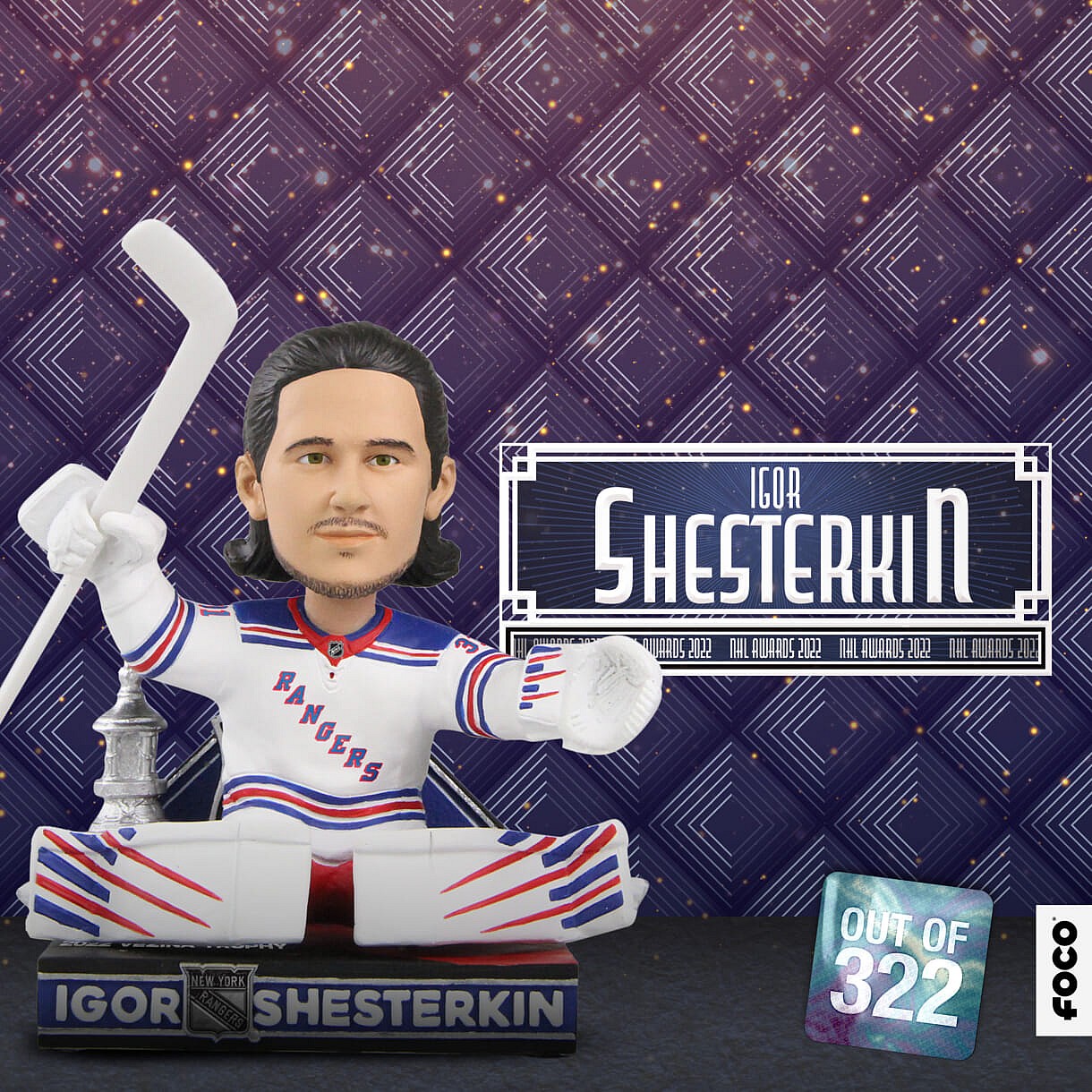 New York Rangers goalie Igor Shesterkin took home the Vezina Trophy as the league’s top NHL goalie this season. To celebrate the accomplishment, Foco has released a new Bobblehead featuring the goaltender and his first Vezina Trophy.