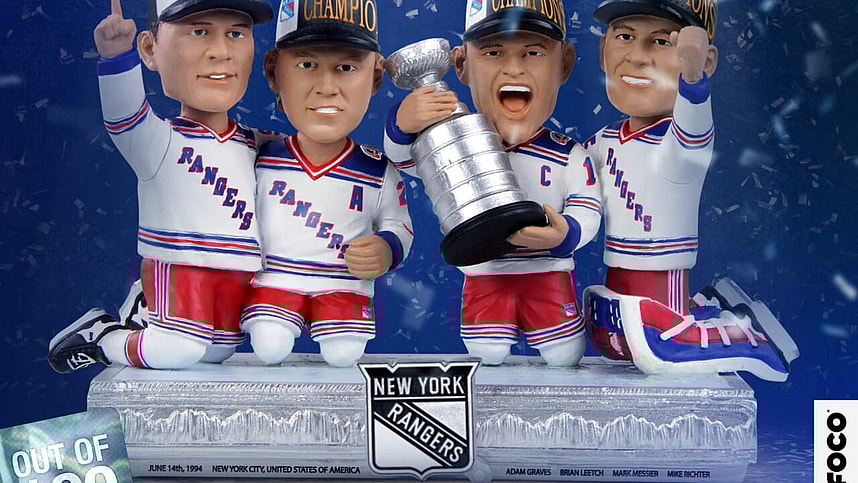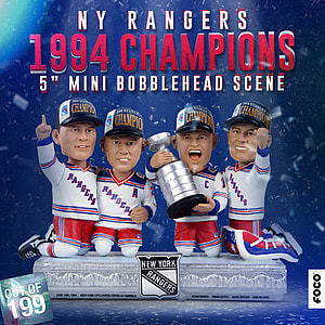 Each player is shown kneeling while wearing the Rangers jersey and Stanley Cup Champs hat. The bobble stands at 5 inches tall and will be numbered out of 199 units. The piece will retail for $120.