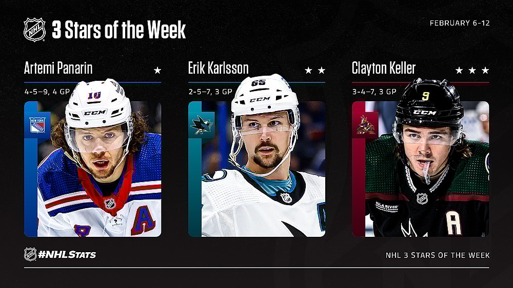 Panarin, who made his first All-Star Game appearance in South Florida, led the NHL with 4-5—9 in four contests to propel the Rangers (31-14-8, 70 points) to a perfect week and their fifth straight win dating to Jan. 27. He collected two assists in a 5-4 overtime victory against the Calgary Flames Feb. 6. Panarin then registered one helper in both a 4-3 triumph over the Vancouver Canucks Feb. 8 and a 6-3 win versus the Seattle Kraken Feb. 10. He capped the week by scoring a career-high four goals (including a natural hat trick that featured the game-winner) and matching a personal best with five points (last achieved March 12, 2022 at DAL: 1-4—5) in a 6-2 victory against the Carolina Hurricanes Feb. 11.