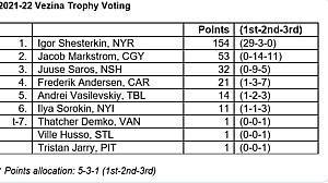 Igor Shesterkin was named the winner of the Vezina Trophy on Tuesday night. The New York Rangers goaltender won the trophy following an incredible 2021-2022 season where he led the league in goals-against average (2.07) and save percentage (9.35). His 36 wins were sixth in the NHL. Shesterkin won the award in his first season playing 50 or more games. He is the 16th goaltender to win the Vezina Trophy in their first season playing 50-plus games and the first since Tuukka Rask (2013-14 – 58 GP).