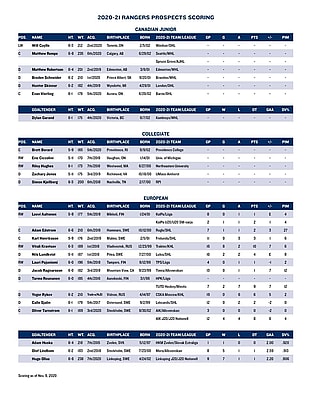 - Olof Lindbom made 31 saves in each of his two appearances during the past week, and he earned a win on Nov. 8 against AIK. The Rangers’ second-round pick (39th overall) in the 2018 NHL Entry Draft has posted a 5-1-1 record, along with a 2.59 GAA and a .913 SV% in eight appearances with Mora in Allsvenskan this season. Lindbom has only allowed nine goals at 5-on-5 in his eight appearances in 2020-21. He is one of five goaltenders 20 years old or younger who have appeared in at least one game in Allsvenskan this season, and he has appeared in more games than any other goaltender 20 years old or younger in the league thus far in 2020-21.