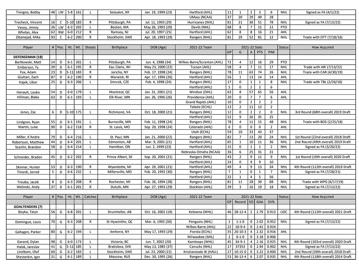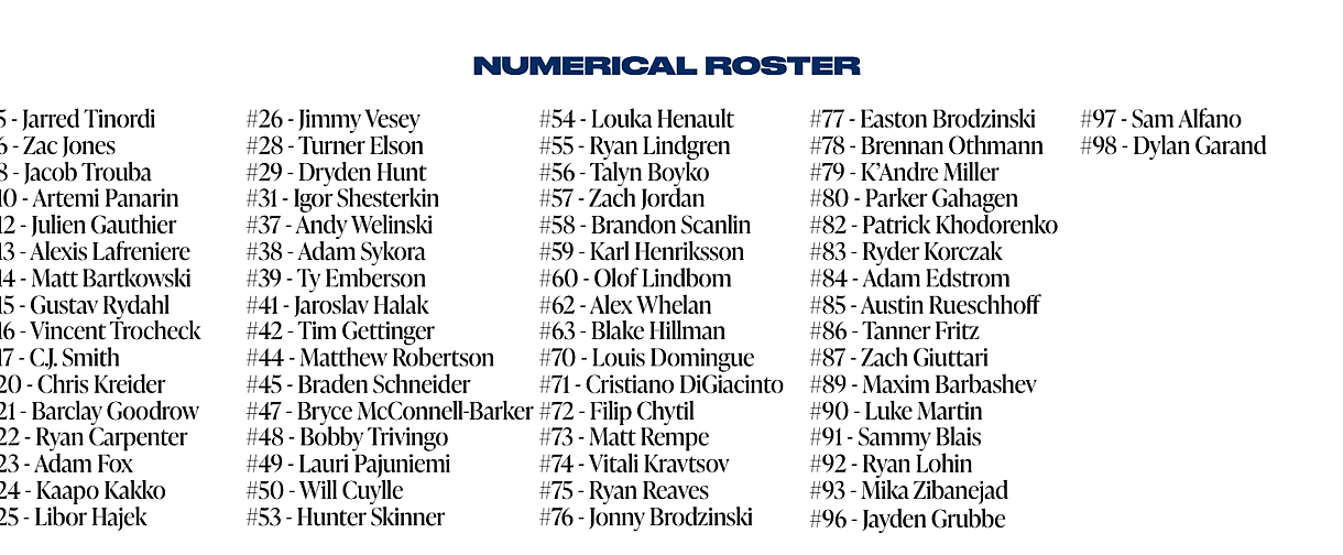 Three draft picks (Maxim Barbashev, Bryce McConnell-Barker, Adam Sykora) from the 2022 Entry Draft will attend camp along with off-season acquisitions Ryan Carpenter, Turner Elson, Gustav Rydahl, Vincent Trocheck, Ty Emberson, Andy Welinski, Jaroslav Halak and Louis Domingue.