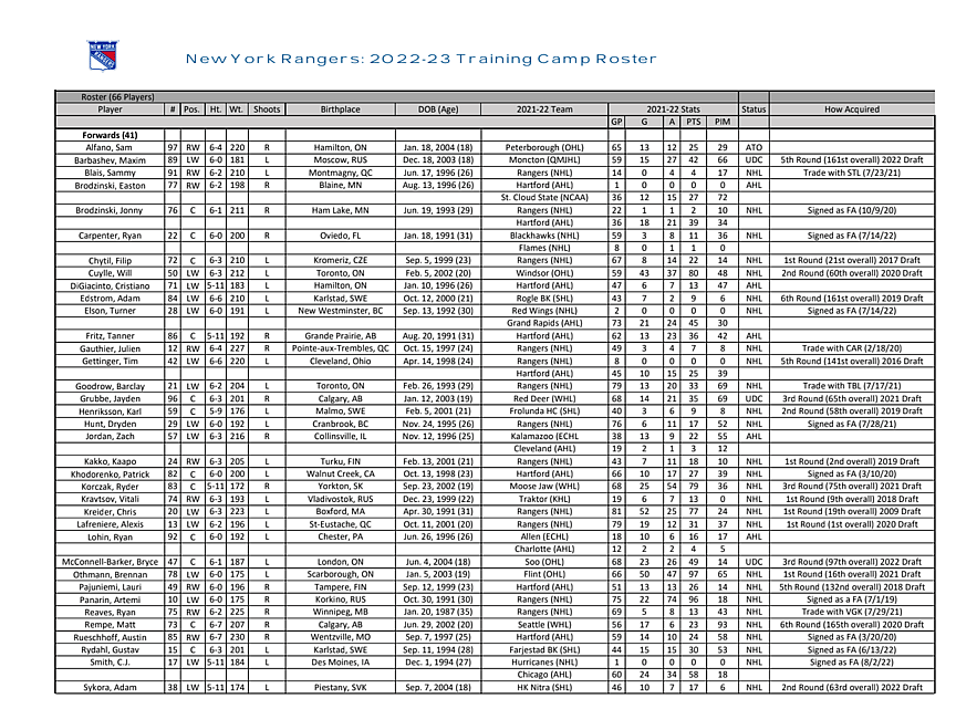 The New York Rangers 2022-2023 season will begin on Wednesday when attaining camp begins with player medicals. This year 66 players were invited to camp, broken down into 41 forwards, 18 defensemen, and seven goaltenders.