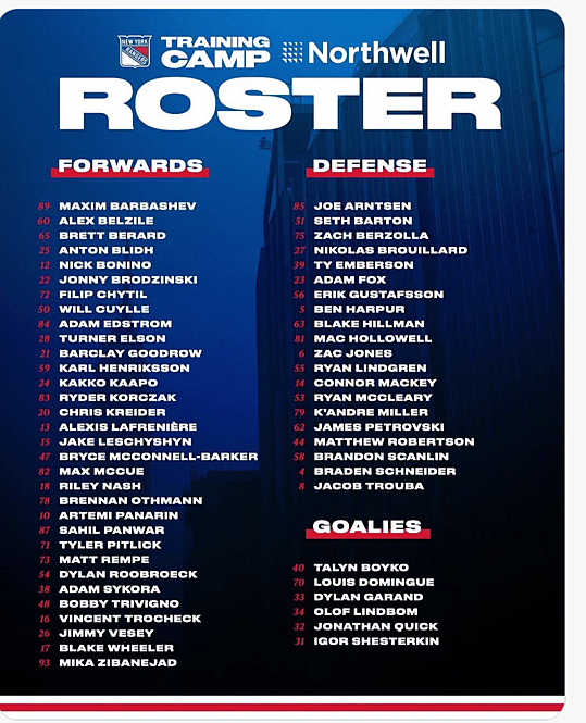 The Rangers’ 58-man training camp roster is divided into 32 forwards, 20 defensemen, and six goaltenders: