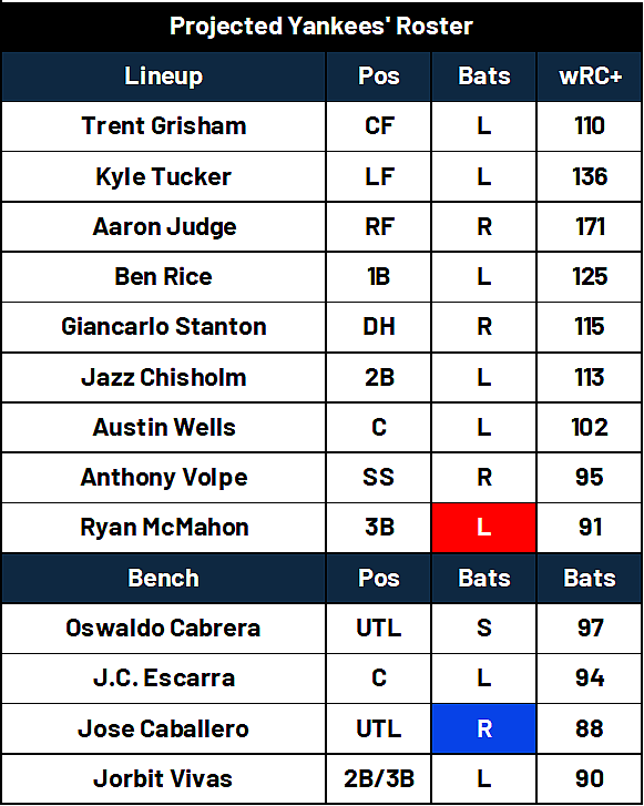 Adding him to the Bronx Bombers would give the team a projected wRC+ of 114 for 2025, meaning their median outcome would be performing at a level similar to the 2025 Dodgers (113).