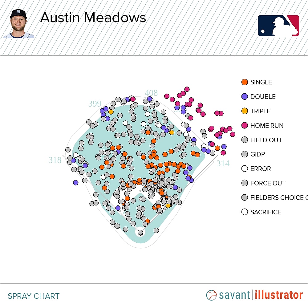 Austin Meadows has a career -12 DRS and -8 OAA in the outfield, but LF happens to be his best position. With 5 DRS and -3 OAA, it’s hard to tell if he’s a good or lousy defender out there, but it’s safe to say he can hold his own out there. He had 3 DRS in LF this past season, but being roughly league-average in LF at Yankee Stadium is really all he needs to do if he’s hitting well. His arm is underwhelming (32nd Percentile Arm Strength), but his reactions, bursts, and feet covered are above average. Comerica has a vast outfield as well, so for him to play solid defense out, there is impressive.