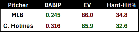 So then, is it luck? Well, it’s pretty hard to argue otherwise right now. He’s allowed a .316 BA on groundballs which is incredible given how soft they’re hit (85.9 MPH), and we’ve seen the defense betray him multiple times. Whether it’s Alex Verdugo not making a catch in left field that had an incredibly high catch probability or Anthony Volpe making a throwing error, Holmes has blown saves on the back of some horrible luck at various points of the season.