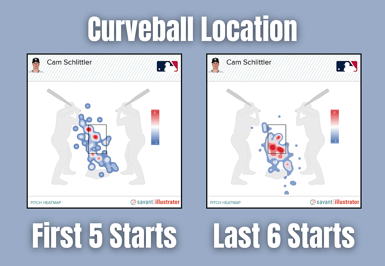 Cam Schlittler has a 111 Location+ on his curveball and a 125 Location+ on his cutter over his last six starts, as batters now have a .226 wOBA on the curve and a .183 wOBA on the cutter.