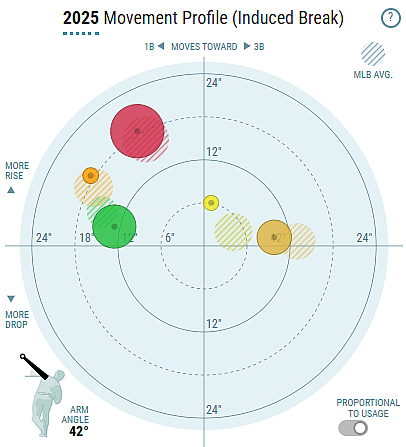 Being able to dial it down a bit to ~95 MPH instead of ~97 MPH would be a great help for his ability to pitch over 100 IP, which he did fairly regularly before the 2025 season.